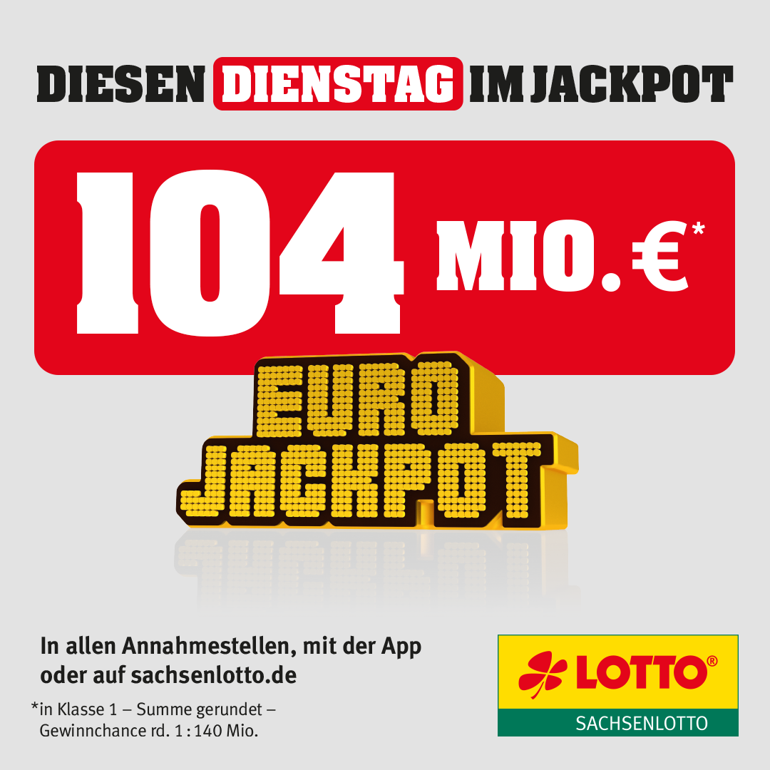 Wer am Dienstag sein Glück für den 104-Millionen-Euro-Jackpot probieren möchte, kann in den Lotto-Annahmestellen, unter sachsenlotto.de bzw. über die Sachsenlotto-App seine Tipps abgeben. Die Gewinnchancen für die Gewinnklasse 1 bei Eurojackpot liegen pro Tipp bei rund 1 : 140 Millionen. Der Jackpot wird mit den richtigen 5 aus 50 Zahlen plus 2 aus 12 Eurozahlen, also insgesamt 7 Zahlen, gewonnen.