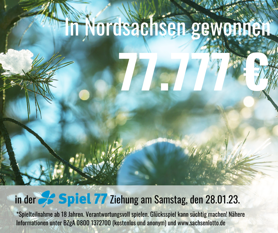 Spiel 77 ist die zweite Zusatzlotterie auf dem Lottoschein und auch sie hat für ein schönes Plus gesorgt: 77.777 Euro gehen nach der Ziehung am Samstag, dem 29. Januar, in den Landkreis Nordsachsen. Es ist der feste Gewinn in der Klasse 2 bei Spiel 77, der nun nach Ostsachsen fällt.