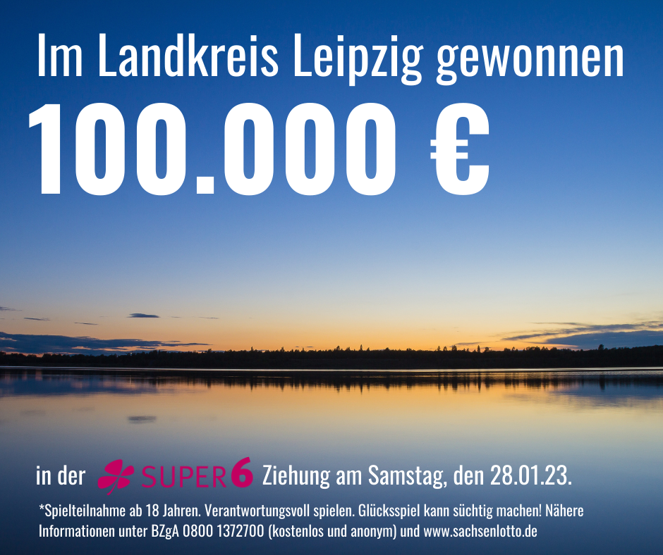 Der erste Höchstgewinn der Lotterie SUPER 6 in diesem Jahr fällt in den Landkreis Leipzig: Die Samstagsziehung vom 28. Januar brachte den 100.000 Euro-Gewinn nach Sachsen. Die Lotterie SUPER 6 hat feste Gewinnquoten – je nachdem, wie viele Ziffern der Spielscheinnummer mit der Gewinnzahl übereinstimmen, desto höher ist der Gewinn: Sind die Zahlen komplett richtig, gibt es 100.000 Euro.
