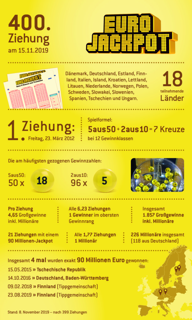 In den bisher 399 Ziehungen machte Eurojackpot insgesamt 226 Spielteilnehmer zu Millionären. Im Schnitt gibt es alle 1,77 Ziehungen einen neuen Eurojackpot-Millionär.