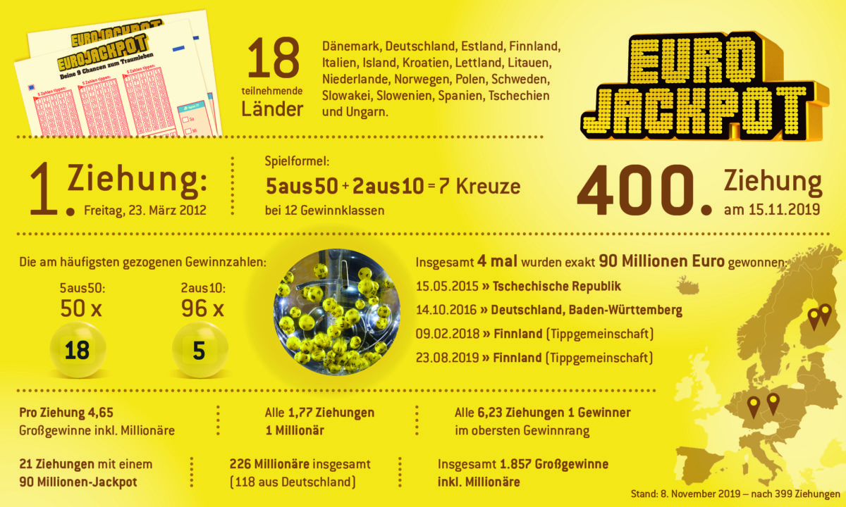 Deutschland ist und bleibt das Land mit den meisten Millionären. Bisher (Stand 8. November 2019) wurden insgesamt 118 Spielteilnehmer in einem der 16 deutschen Bundesländer durch die Lotterie Eurojackpot zu Millionären.