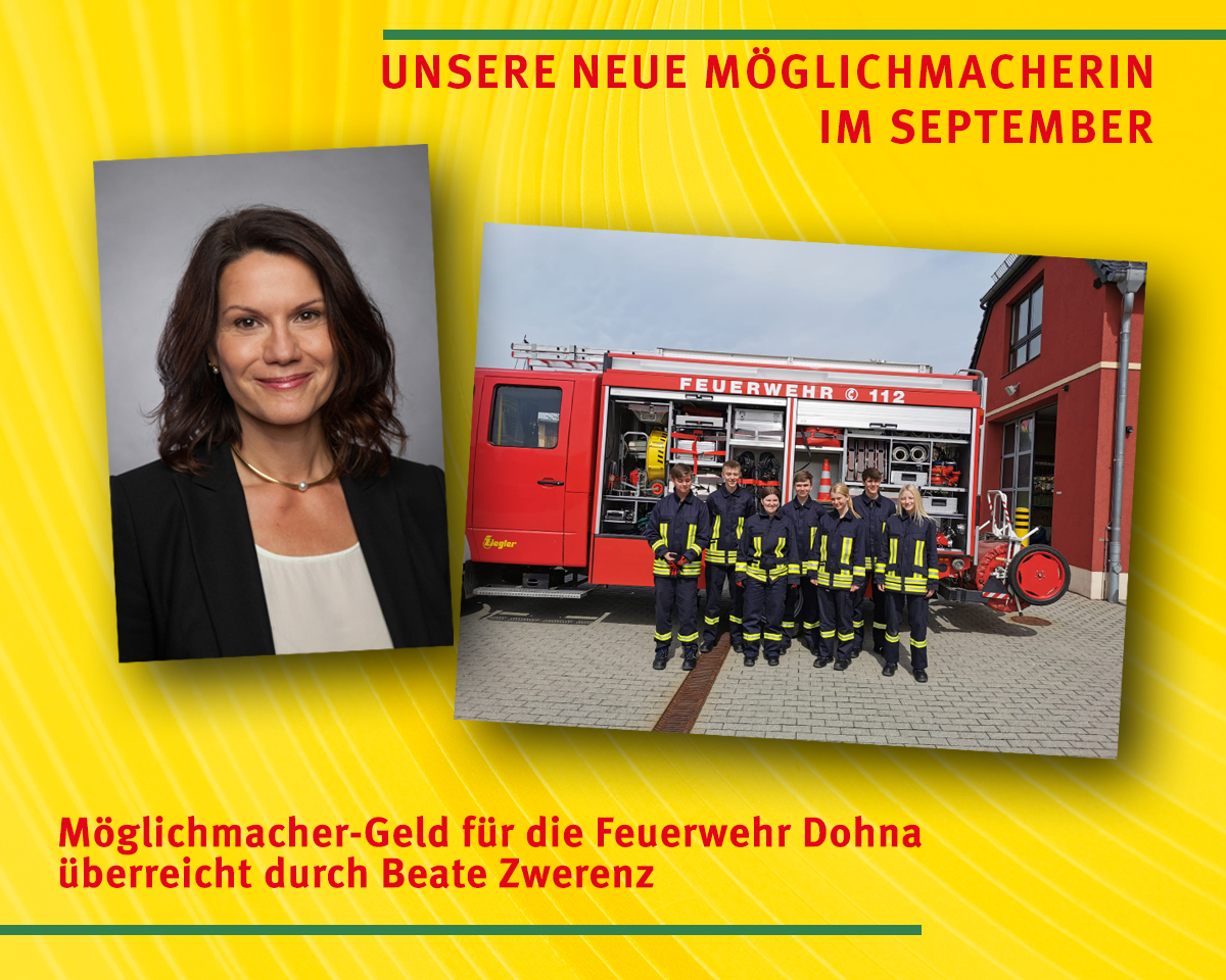 Dies weiß auch Beate Zwerenz. Im Monat September ist die Geschäftsführerin der ORTEC Messe und Kongress GmbH die neue „Sachsenlotto-Möglichmacherin“. Und in dieser Funktion wird die gebürtige Dresdnerin die Möglichmacher-Summe in Höhe von 5.000 Euro an die Freiwillige Feuerwehr Dohna übergeben.