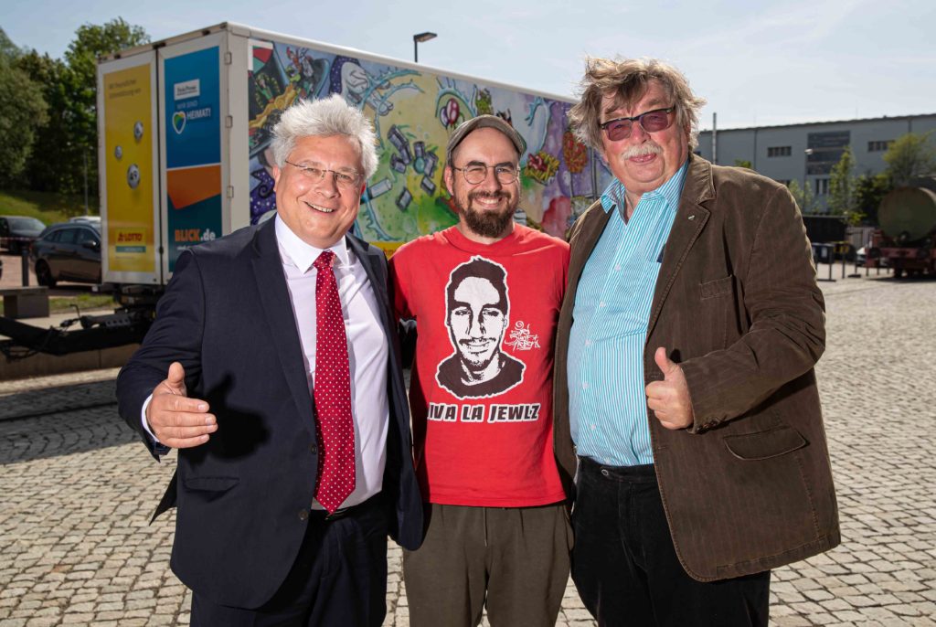 Zur Ausstellungseröffnung brachte Klaus Illgen (Mittelsächsische Schaustellerverband, rechts) den LKW-Anhänger mit dem Siegermotiv – sehr zur Freude von Sachsenlotto-Geschäftsführer Frank Schwarz und des Künstlers, René Di Carlo (Mitte):