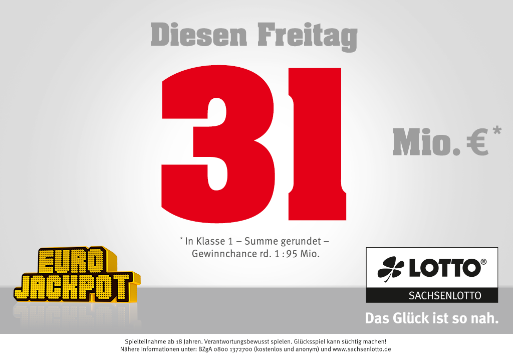 Um diesen Jackpot zu gewinnen, müssen 5 aus 50 Zahlen und 2 aus 10 Eurozahlen, also insgesamt 7 Zahlen, richtig getippt werden. Die Gewinnchancen für die Gewinnklasse 1 in der europäisch koordinierten Lotterie Eurojackpot liegen pro Tipp bei rund 1 : 95 Millionen. Für die Ziehung am Freitag kann man unter sachsenlotto.de, über die Sachsenlotto-App sowie in den Sachsenlotto-Annahmestellen mitspielen. Ein Tipp kostet 2 Euro.