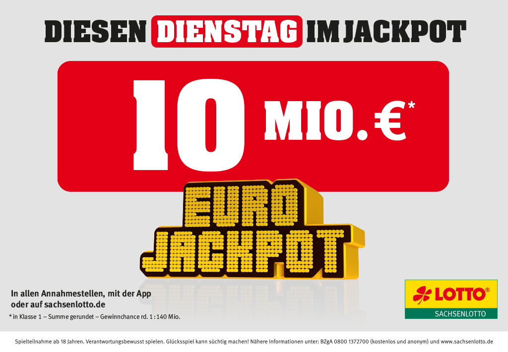 Bei Eurojackpot werden 5 aus 50 Zahlen und 2 aus 12 Eurozahlen, also insgesamt 7 Zahlen, getippt. Die Gewinnchance zum Knacken des Eurojackpots beträgt rund 1 : 140 Millionen. Ein Tipp kostet 2 Euro. Mitspielen kann man in allen Sachsenlotto-Annahmestellen, unter www.sachsenlotto.de und mit der Sachsenlotto-App.