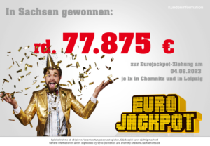 Der prall gefüllte Eurojackpot sorgte in der Freitagsziehung am 4. August europaweit für Gewinne und strahlende Gesichter – allen voran der Hamburger, der den Jackpot mit 117 Millionen Euro gewonnen hat. Gleich neun weitere Mitspieler erreichten am Freitag die Gewinnklasse 2, in der Gewinnklasse 3 gibt es europaweit insgesamt 25 Gewinner, zwei davon aus Sachsen. Ein Glückspilz aus Chemnitz und ein Online-Spieler lagen mit den fünf Gewinnzahlen „3, 17, 19, 32, 38“ goldrichtig und sicherten sich damit 77.857 Euro aus Gewinnklasse 3. Beide Spielscheine wurden am Nachmittag der Freitagsziehung am 4. August abgegeben.