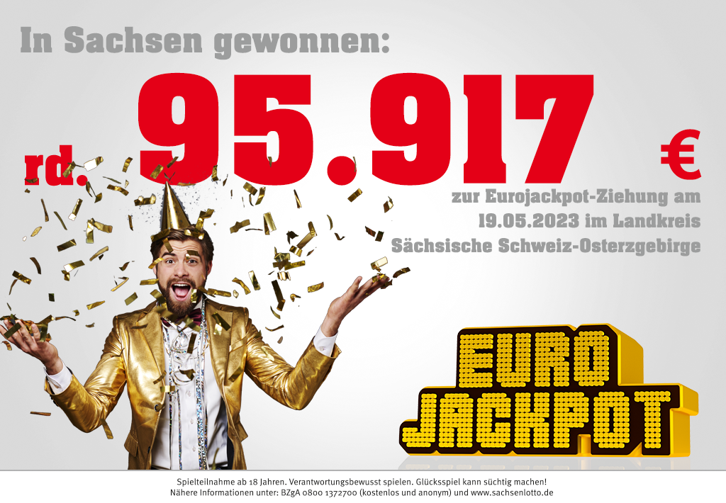 95.917,20 Euro warten nun auf ihre Gewinnanmeldung. Der Eurojackpot-Spielschein mit den Gewinnzahlen wurden am 19. Mai nachmittags in einer Sachsenlotto-Annahmestelle im Landkreis Sächsische Schweiz-Osterzgebirge gespielt, ohne Kundenkarte und damit anonym. So ist nicht bekannt, ob es sich um einen Gewinner oder eine Gewinnerin handelt. Das bedeutet, es gibt keine Nachricht von Sachsenlotto, er oder sie muss sich selber melden. Das ist noch nicht geschehen. Vielleicht wird der Spielschein erst beim nächsten Gang in die Annahmestelle wieder hervorgeholt – und dann wartet eine schöne Überraschung bei der Gewinnprüfung.