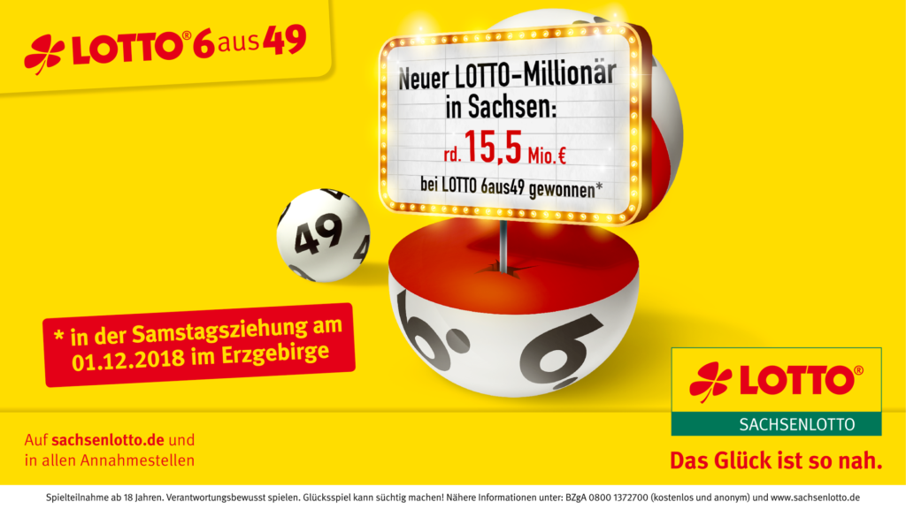 Genau 15.518.060,30 Euro gewinnt ein Lottospieler aus dem Erzgebirge nach der Samstagsziehung am 1. Dezember 2018. Er hat bundesweit als einziger Mitspieler „6 Richtige plus Superzahl“ und knackt damit den Jackpot, der sich in den letzten Wochen bei LOTTO 6aus49 aufgebaut hat.