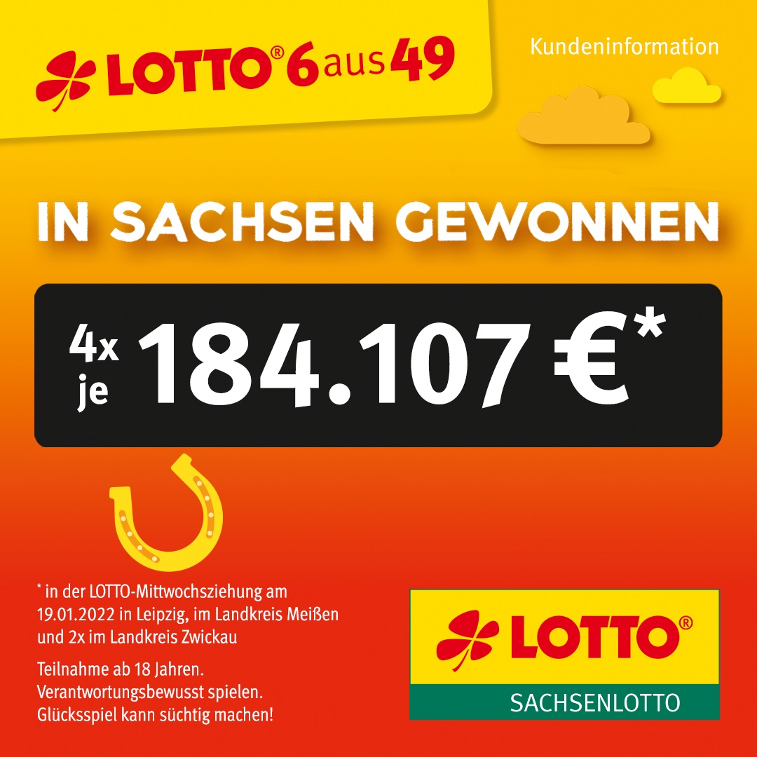 Der Landkreis Zwickau startet in diesem Jahr mit gleich zwei Hochgewinnen, denn zwei Mitspieler haben in der Mittwochsziehung „5 Richtige plus Superzahl“ auf ihren Tippscheinen. Beide Gewinner waren in einer Sachsenlotto-Annahmestelle, beide haben am Dienstag ihre Tipps abgegeben: Einer in der Mittagszeit und einer am Abend. Es gibt aber einen wichtigen Unterschied – während der eine Glückspilz seinen Spielschein anonym gespielt hat, hat der andere seine Sachsenlotto-Kundenkarte eingesetzt. Damit kann ihm nun der Gewinn zugeordnet werden und er erhält automatisch eine Gewinnüberweisung von der Sächsischen Lotto-GmbH. Für den anderen Gewinner heißt es nun, seinen Gewinn selber anzumelden. Dafür gibt es in den Sachsenlotto-Annahmestellen die erforderlichen Unterlagen für alle Großgewinne, also für alle Gewinne über 1.000 Euro.