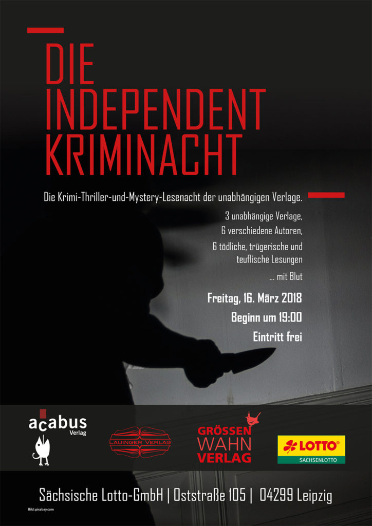 Auch in der Zentrale des Glücks, in der Sächsischen Lotto-GmbH, wird zur Lesung geladen – zur 2. Kriminacht im Lottohaus. Die Krimi-Thriller-und-Mystery-Lesenacht der unabhängigen Verlage findet am Freitag, dem 16.03.2018, im Lottohaus in der Oststraße 105 in 04299 Leipzig statt.