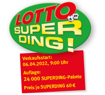Der Startschuss für den Verkauf des LOTTO SUPERDING ist am Mittwoch, 6. April 2022, Punkt 9:00 Uhr in allen Sachsenlotto-Annahmestellen. → Annahmestellenfinder