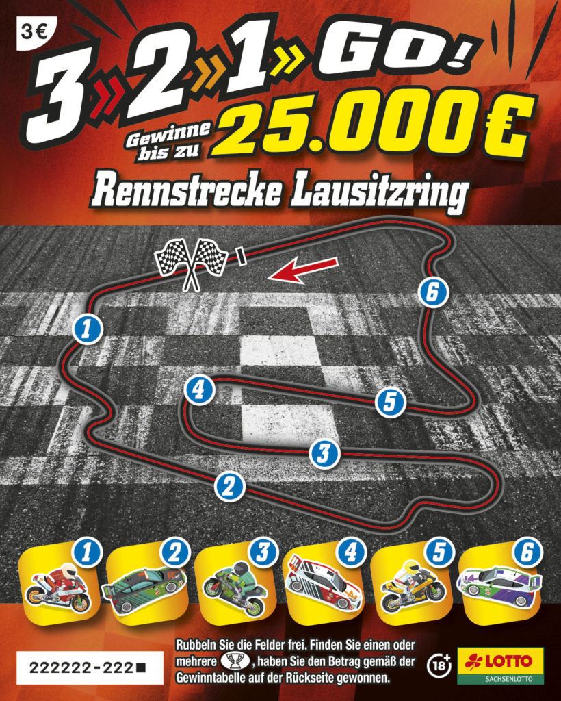 Vier ostdeutsche Rennstrecken sind die Motive des neuen 3 Euro-Loses und laden mit ihrem regionalen Sammelcharakter zum Rubbeln ein. „3, 2, 1 Go!“ hält Gewinne zwischen 5 Euro und 25.000 Euro (Chance auf den Höchstgewinn 1 : 500 000) bereit. Mit dem Mindestgewinn von 5 Euro (Chance rd. 1 : 6) gibt es hier fast das Doppelte des Lospreises zurück. Einfach die sechs gelben Felder im unteren Bereich des Loses freirubbeln und nach einem Pokal Ausschau halten. Der Gewinn ergibt sich aus der Anzahl an freigerubbelten Pokalen.