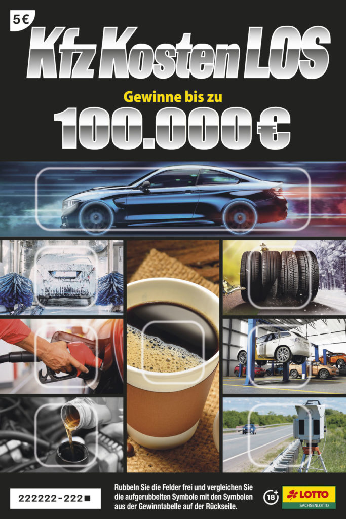 Bei einem Lospreis von 5 Euro liegt der Höchstgewinn des „Kfz-Kosten-LOS“ bei stolzen 100.000 Euro (Chance 1 : 500 000) und kann damit so manche Kosten rund um das Auto ersparen. Immerhin hält das Rubbellos die besten Gewinnchancen unter allen sächsischen 5 Euro-Losen bereit. Natürlich steht das Los nur symbolisch für die „Autokosten“ und kann auch anderweitig eingesetzt werden. Einfach die einzelnen Rubbelfelder auf den acht Bildmotiven freirubbeln und vergleichen, ob das benötigte Gewinnsymbol zu finden ist. Die jeweiligen Gewinnsymbole verbildlichen den entsprechenden Gewinn.