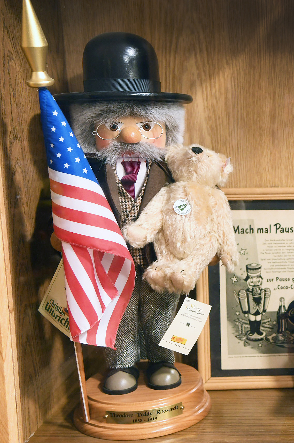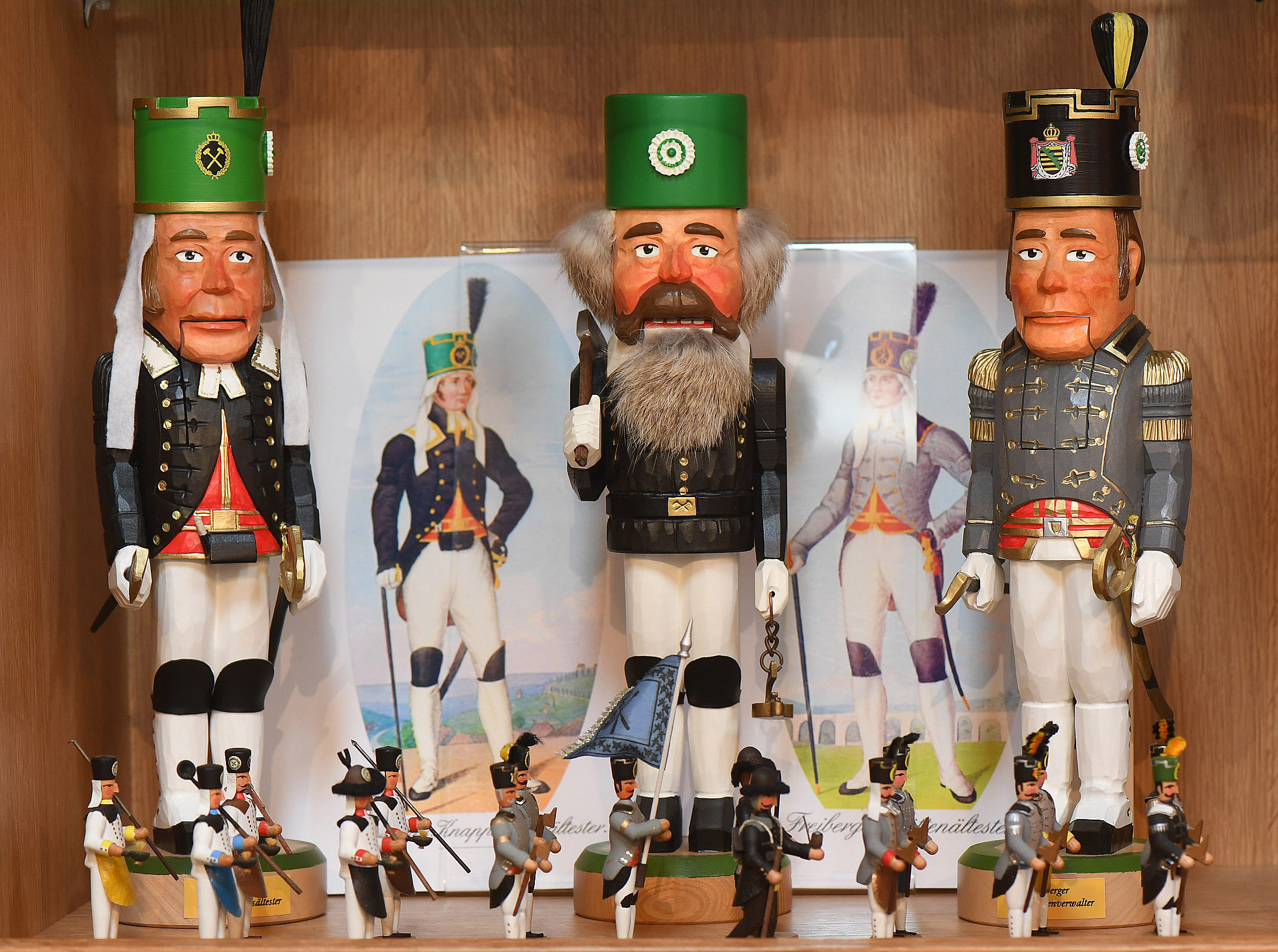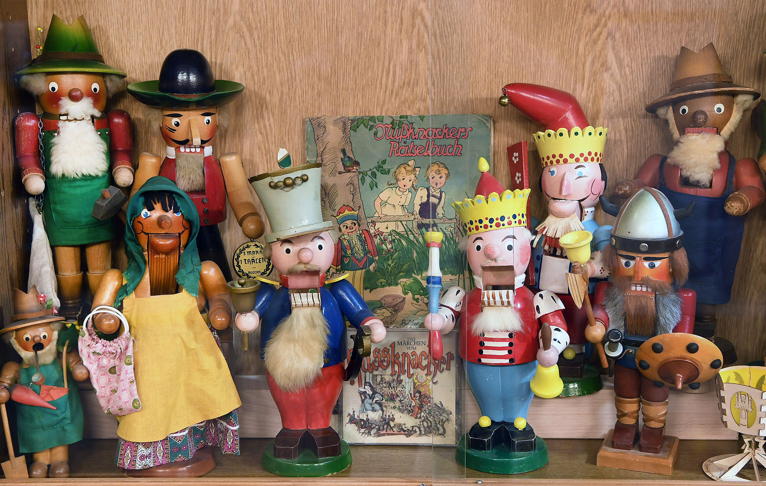 Dazwischen Figuren aus dem einfachen Volk: Pilze Sammler, Wanderburschen, Nachtwächter und Bergmänner in schmucken Uniformen. Märchenfiguren wie der Kleine Muck, Rumpelstilzchen, Baron Münchhausen sind ebenso vertreten wie ausgefallenen Exemplare – Starwars-Helden, Cowboys, Sportler oder Vertreter aus der Politik. So fanden Bismarck und Napoleon Bonaparte friedlich vereint fast in der gleichen Vitrine Platz und knacken Bertis Fußball-WM-Helden manch sportliche Nuss.