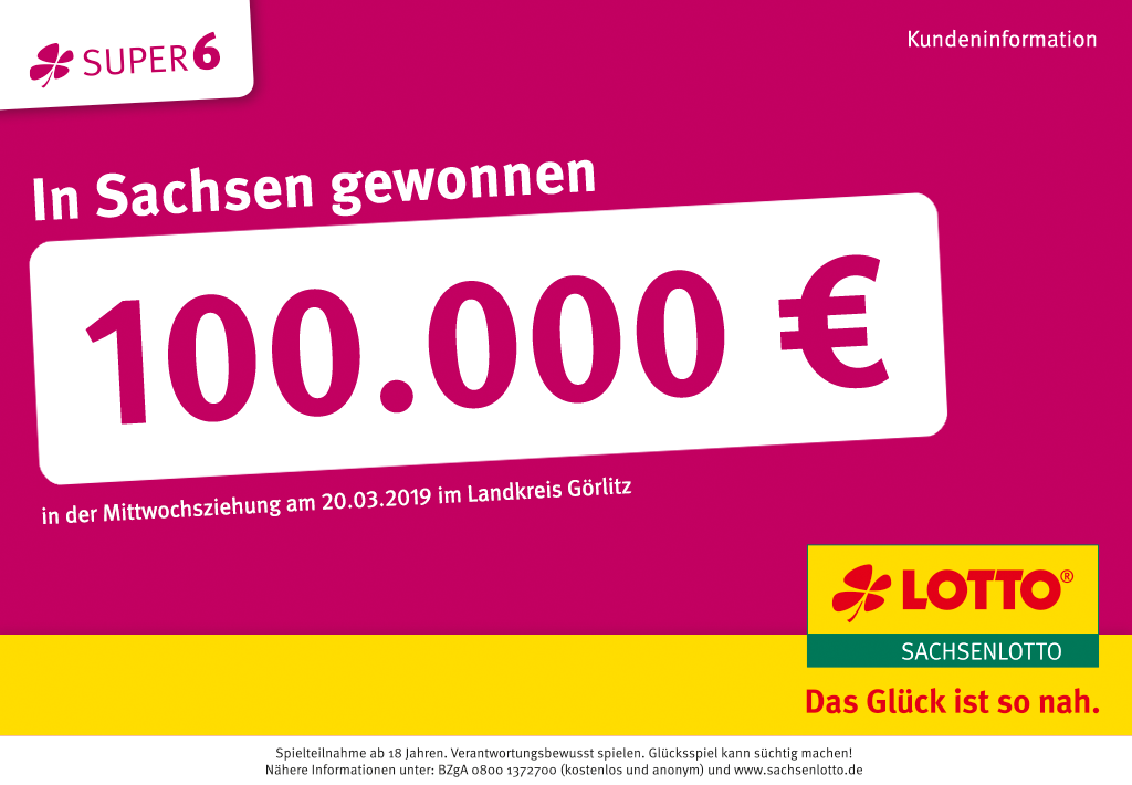 100.000 Euro und damit den Höchstgewinn der Lotterie SUPER 6 sicherte sich ein Glückspilz aus dem Landkreis Görlitz zur Mittwochsziehung am 20. März 2019. SUPER 6 kann zusätzlich über die Spielscheine für LOTTO 6aus49, Eurojackpot, GlücksSpirale sowie TOTO gespielt werden. Maßgeblich ist die Spielscheinnummer: Je mehr Ziffern in der richtigen Reihenfolge mit der Gewinnzahl überein-stimmen, desto höher ist der Gewinn. Gewonnen wird bereits mit einer richtigen Endziffer. Stimmt die Gewinnzahl komplett überein, gibt es den Höchstgewinn von 100.000 Euro.