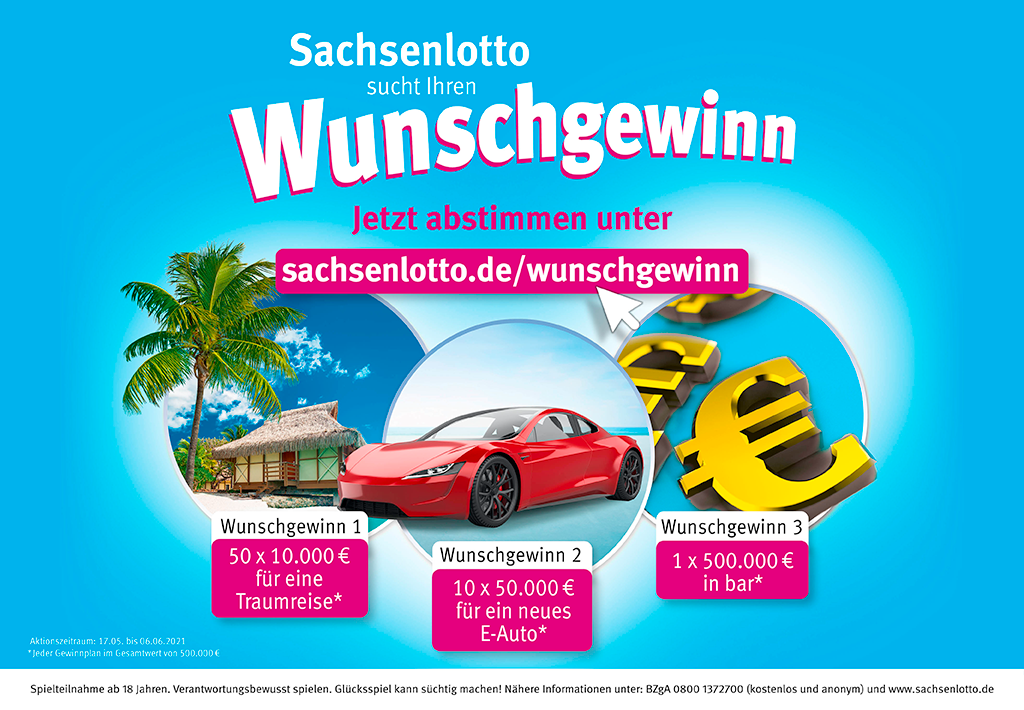 Die Abstimmung ist jetzt unter www.sachsenlotto.de/wunschgewinn gestartet und jeder kann mitmachen. Zur Wahl stehen Traum-Reisen, E-Autos oder Bargeld. Diese finden sich in den Gewinnplänen wieder und jeder lädt zum Träumen ein: 50 x 10.000 Euro für eine Traumreise, mit der lang aufgeschobene Pläne wahr werden könnten, oder 10 x 50.000 Euro für ein neues, umweltfreundliches E-Auto oder 1 x 500.000 Euro in bar. Welcher Gewinnplan die meisten Stimmen bekommt, entscheiden jetzt unsere Kunden.