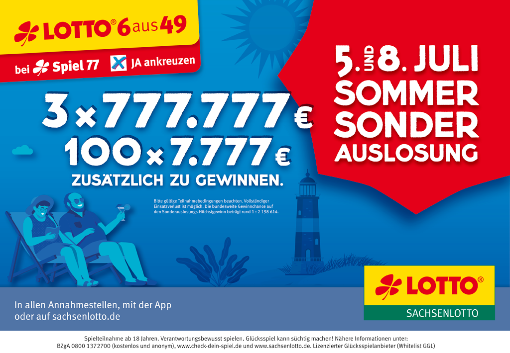 Damit lässt sich der Sommer wunderbar starten, denn diese Sondergewinne werden zu den Ziehungen am Mittwoch, 5. Juli, und Samstag, 8. Juli, verlost. Alle Spielscheine, die an einer oder beiden Ziehungen teilnehmen, sind automatisch dabei – die aus der Annahmestelle und dem Dauerspiel, ebenso wie die übers Web oder die App gespielten Scheine.