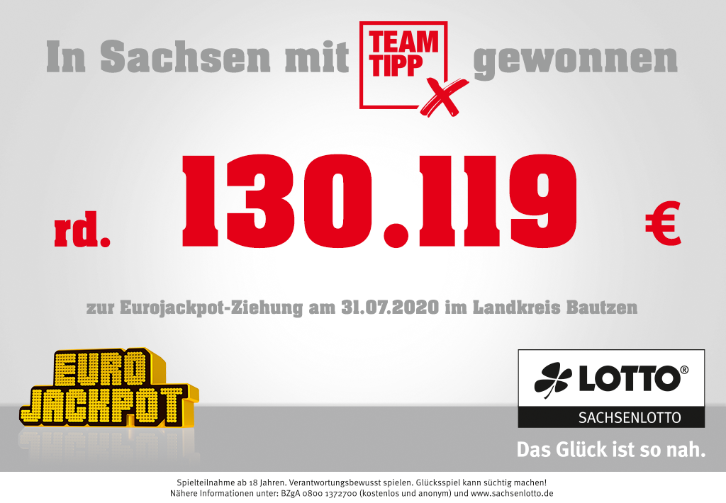 Eine Team-Tipp-Spielgemeinschaft mit 8 Mitspielern aus dem Landkreis Bautzen hat gemeinsam einen Eurojackpot-Systemschein gespielt.
