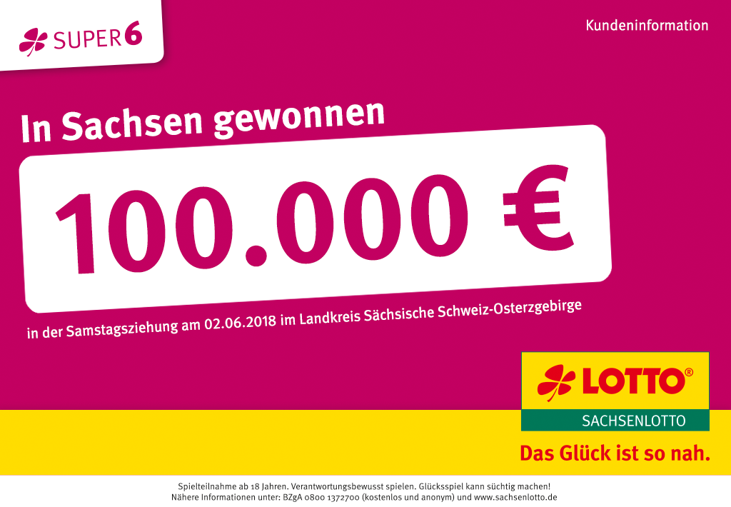 Das Wochenende brachte den Höchstgewinn in der SUPER 6 in den Landkreis Sächsische Schweiz-Osterzgebirge. 100.000 Euro gewinnt ein Glückspilz nach der Ziehung am Samstag, dem 02. Juni 2018.