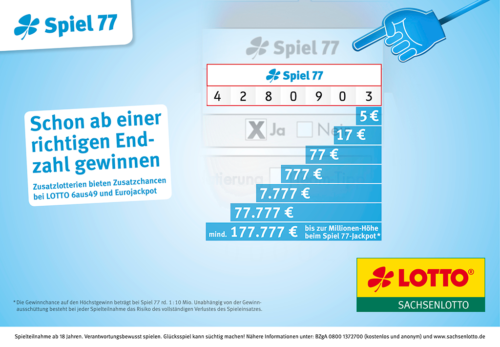Erneut brachte die Zusatzlotterie Spiel 77 einen Großgewinn in den Freistaat. Die Ziehung vom Samstag, dem 19. Oktober 2019, sorgte für den mittlerweile 14. Gewinn in Höhe von 77.777 Euro in Sachsen im Jahr 2019, über den sich ein Glückspilz aus dem Landkreis Görlitz freut. Spiel 77 kann, genauso wie SUPER 6; zusätzlich über die Spielscheine für LOTTO 6aus49, GlücksSpirale, TOTO und über Eurojackpot gespielt werden. Der Spieleinsatz beträgt 2,50 Euro pro Spiel.